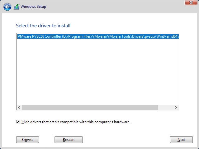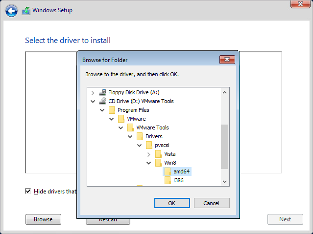 - Navigiere zum Pfad “D:\Program Files\VMware\VMware Tools\Drivers\pvsci\Win8\amd64” und klicke auf “OK”
