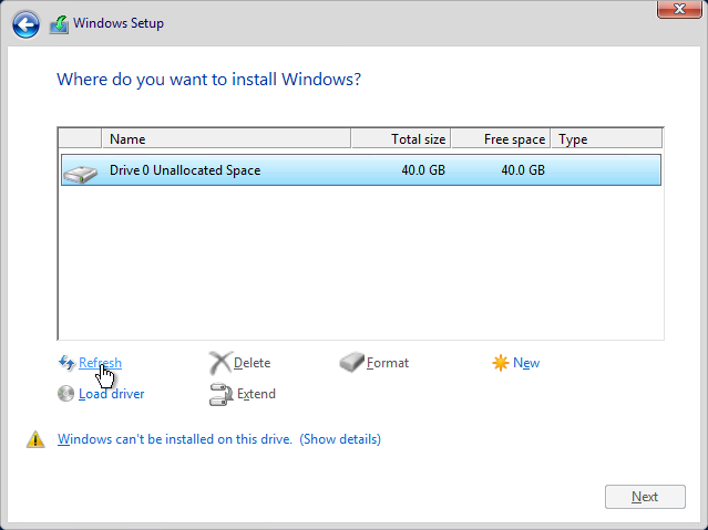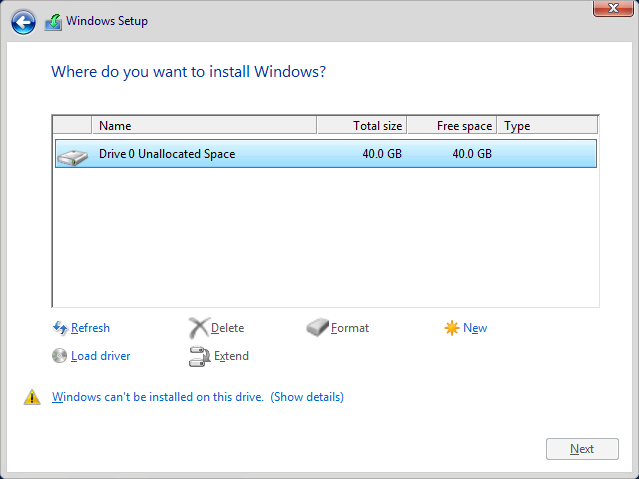- Das Laufwerk wurde gefunden, aber du erhälst eine Warnung, dass Windows nicht auf dieses Laufwerk installiert werden kann.