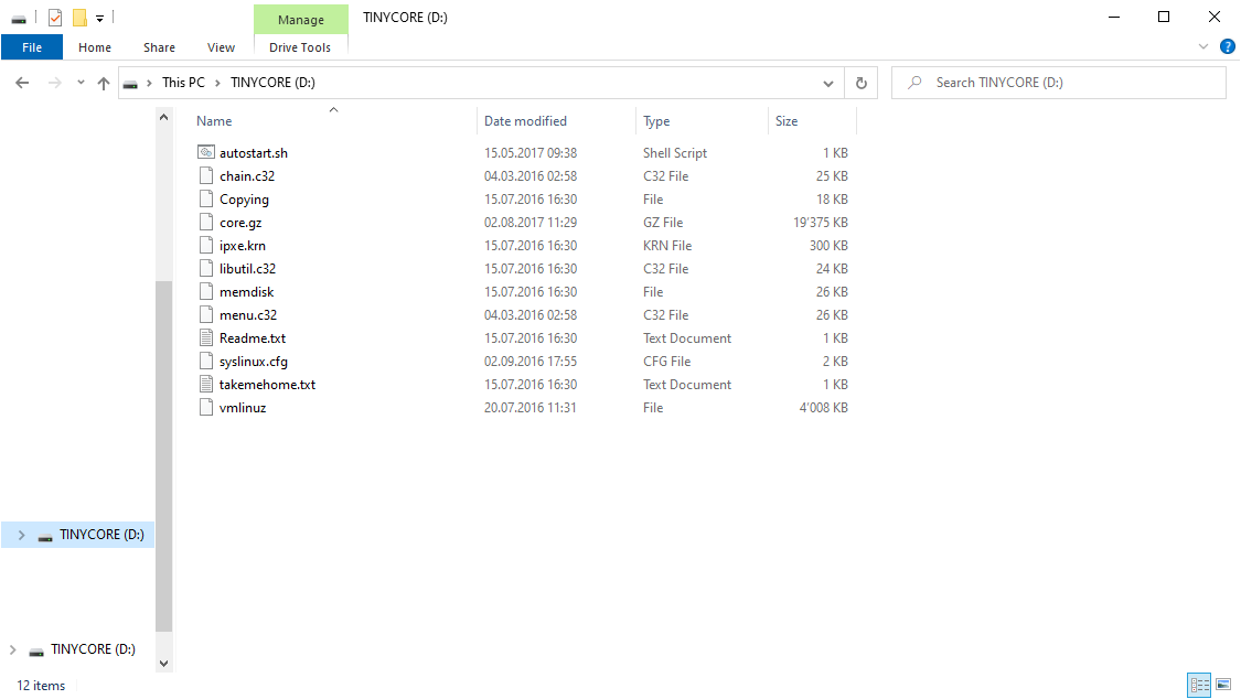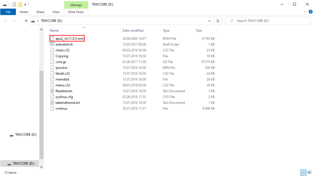 Zuerst laden wir uns das Hlfsprogramm zum erstellen des bootbaren USB-Sticks herunter, der ein TinyCoreLinux zur Verfügung stellt mit allen Tools: https://pcengines.ch/howto.htm#TinyCoreLinux