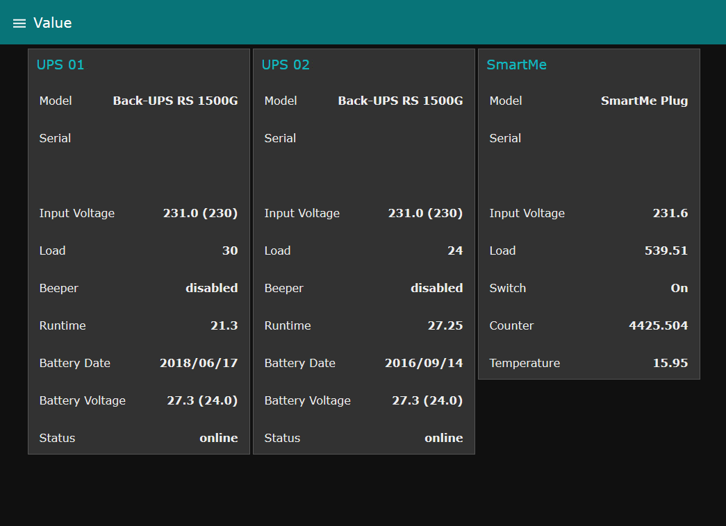 Die Idee war dann ganz einfach, ich habe noch ein Karton mit RaspberryPi’s, also bau ich mir schnell mal ein Raspi zusammen, dass Ding hat ganze 4 USB Anschlüsse, sprich da passen 4 USV ran. Was ich noch zu entscheiden hatte, mit welchem Daemon frage ich die USVs ab. Für APC gäbe es extra den apcupsd, aber nach einer Weile herumprobieren und USB Ports via udev zu fixieren, war mir das eigentlich zu kompliziert, um da eine anständige Lösung, die man auch ruhigen gewissens in einem Betrieb einsetzten kann, zu veröffentlichen. Es gibt aber auch noch “nut” als Software, die auch sehr einfach den Status im Netzwerk anbieten kann. Daher für mich Ideal.