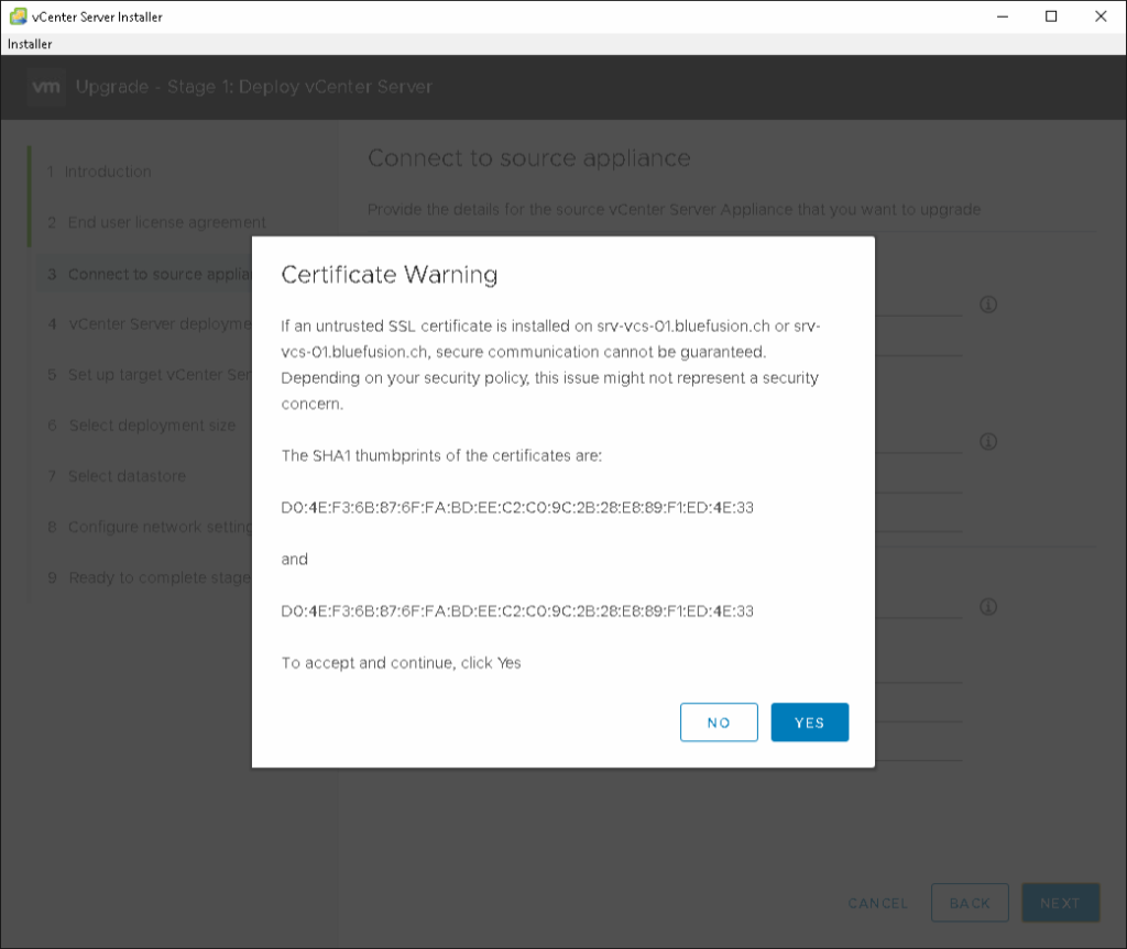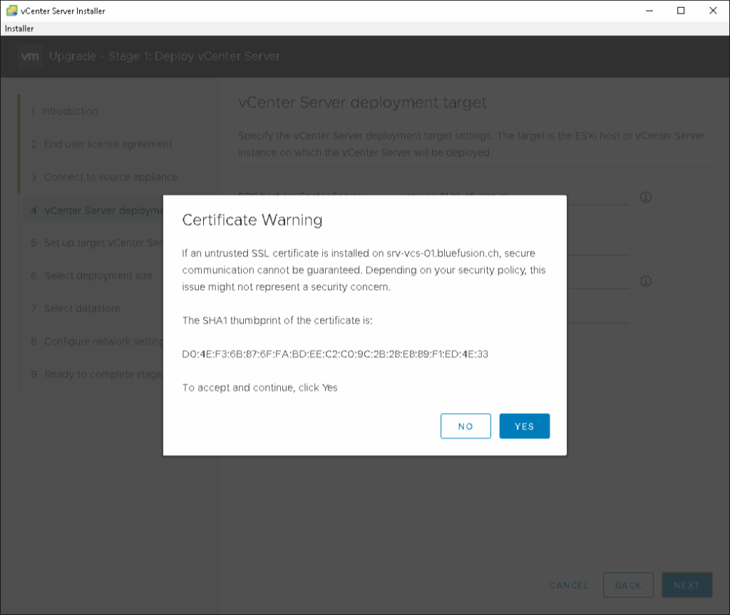 - Firewallrules erstellen, damit die Temporäre Appliance zum bestehenden vCenter und zu allen Hosts kommunizieren kann. Dabei muss mindestens die Ports 22-ssh und 443-https